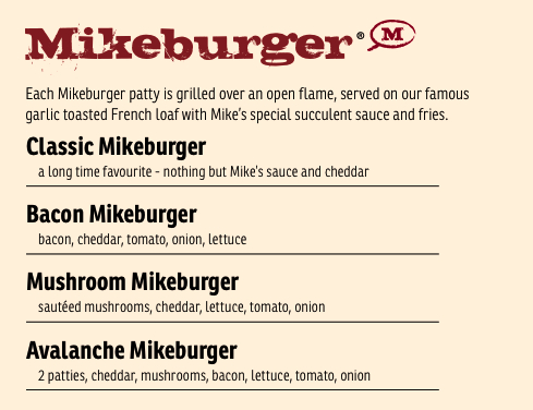Mr Mikes menu Mike Burger options! Source: MrMikes.ca