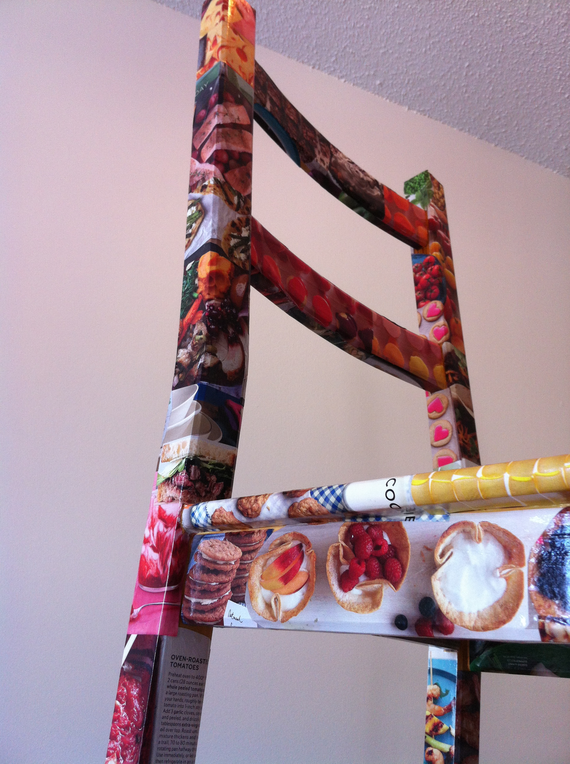 But one can only keep so many magazines around the house, although I was reluctant to simply throw them out (i.e. recycle). I came up with the idea to redecorate one of my kitchen chairs. I have some unfinished birch chairs from Ikea and they make for the perfect canvas….