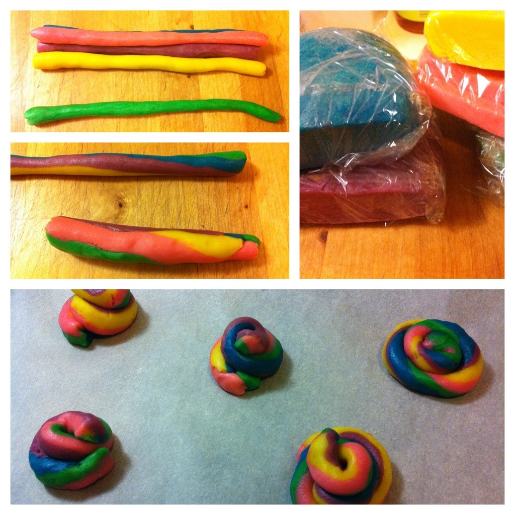 It’s basically a sugar cookie dough, divided up and coloured with gel food colouring. Once each colour is made, you wrap it up and refrigerate for at least an hour.