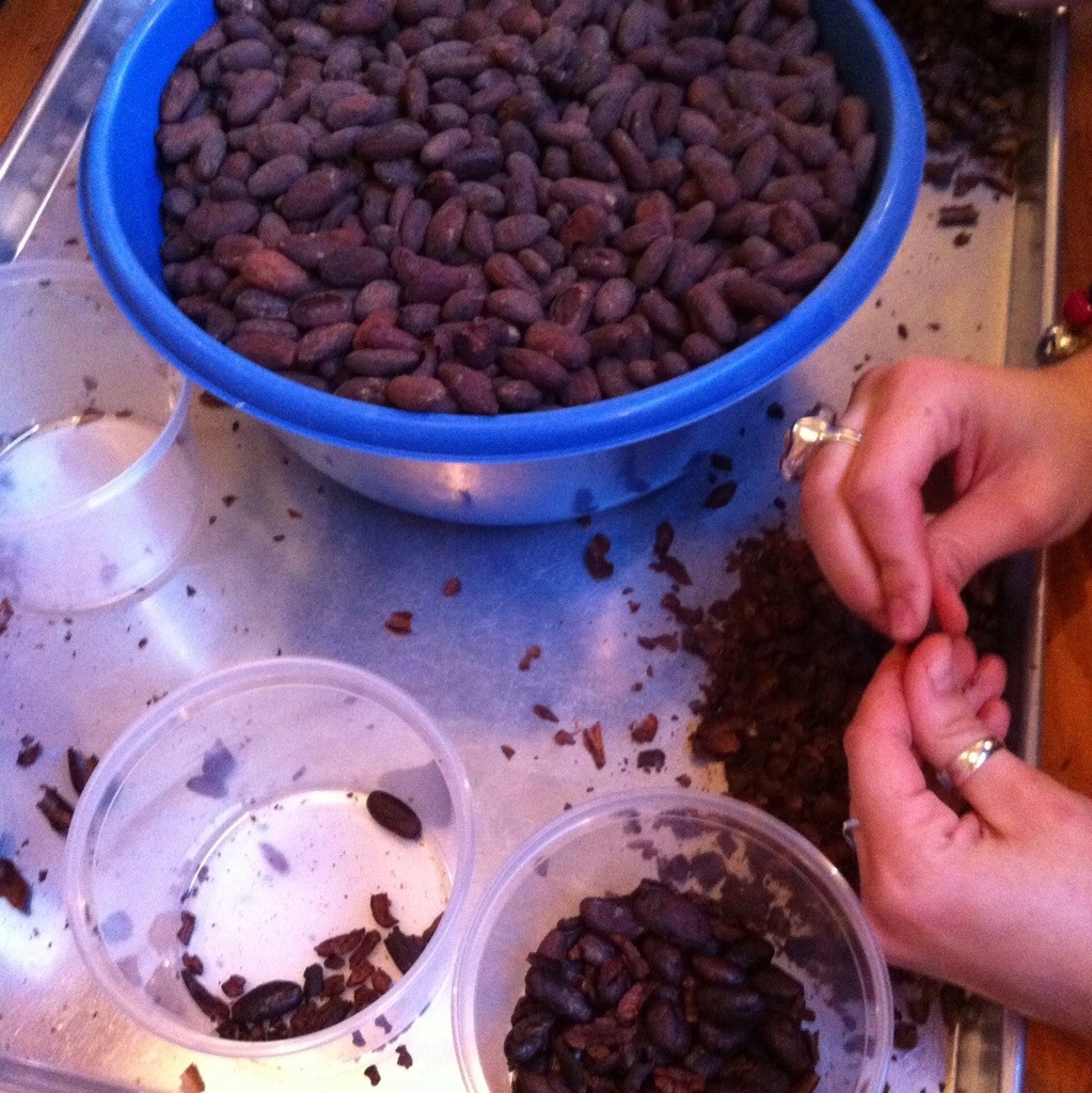 Once the cocao beans are roasted they puff up into the form below, where there is a shell on the outer edge that needs to be winnowed off. Basically we gently crunched the bean and the shell comes off but often the bean crumbles too, so we sorted through the shells and beans. We chatted among our tables and met new people – agreeing that it was nice to experience something different like this in Vancouver.
