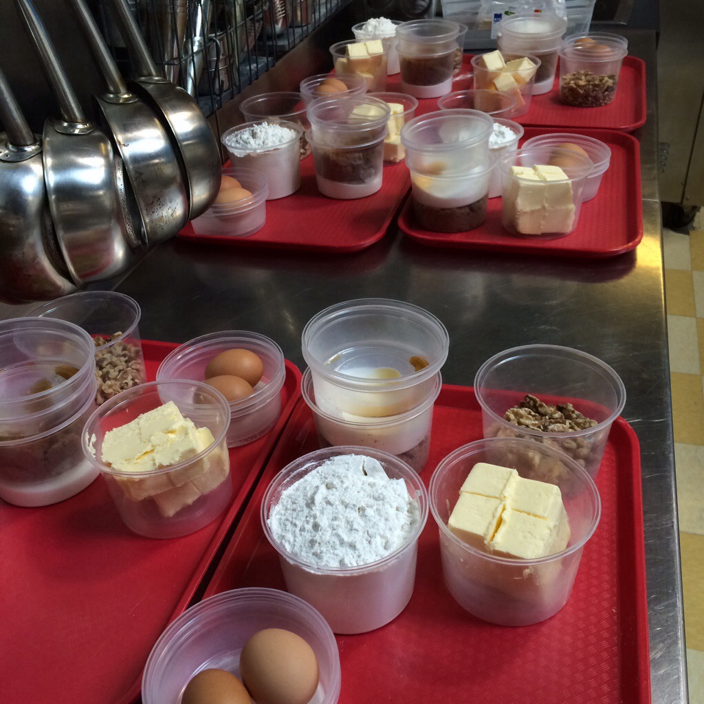 Below is what scaling preparation looks like. We prepare all the ingredients in each recipe for each station in our class, so we are ready to make the recipe (it’s called mise en place, everything in it’s place). Everything in pastry is measured by weight too, using the metric system – so each recipe is consistent. Math skills are important here. I’m grateful that I’ve always been good at math!20140504-221210.jpg