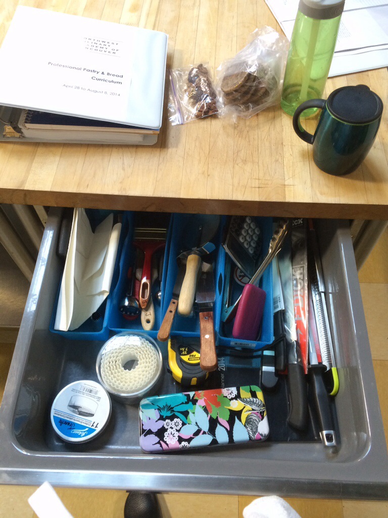 And here is my station drawer. We have two students to a station and two stations per group. Some recipes require a partner and others are done in the group. In week one we made over 20 different types of cookies to learn all the different cookie method types, including making our own cookie developed from scratch! 20140504-221248.jpg