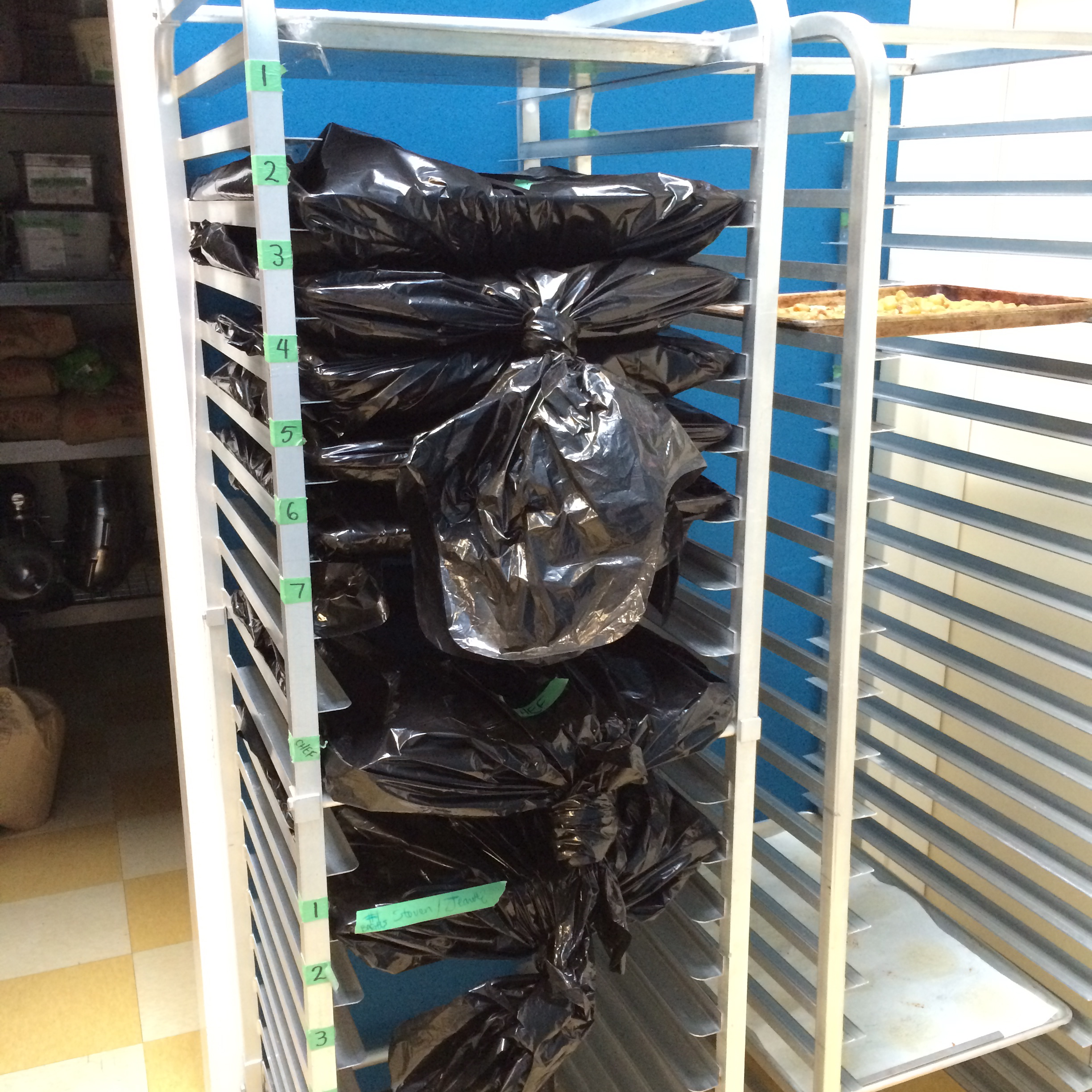 We also made bagels! They were AMAZING! Here they are proofing in plastic bags overnight, before we finished them up to bake.