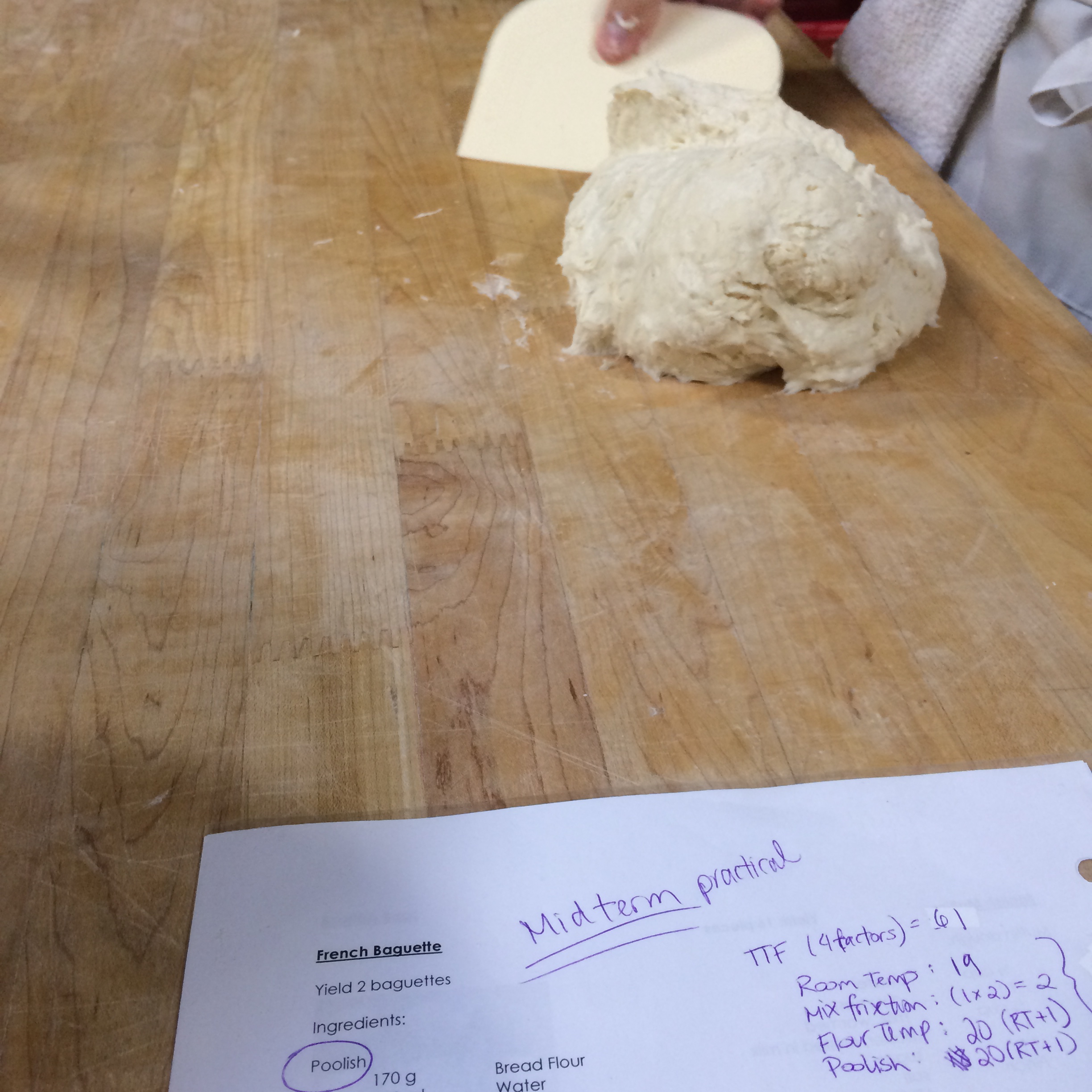 The kneading of baguette dough continues, my station partner and I took turns throughout the steps. We will be graded on our baguettes during the midterm practical.