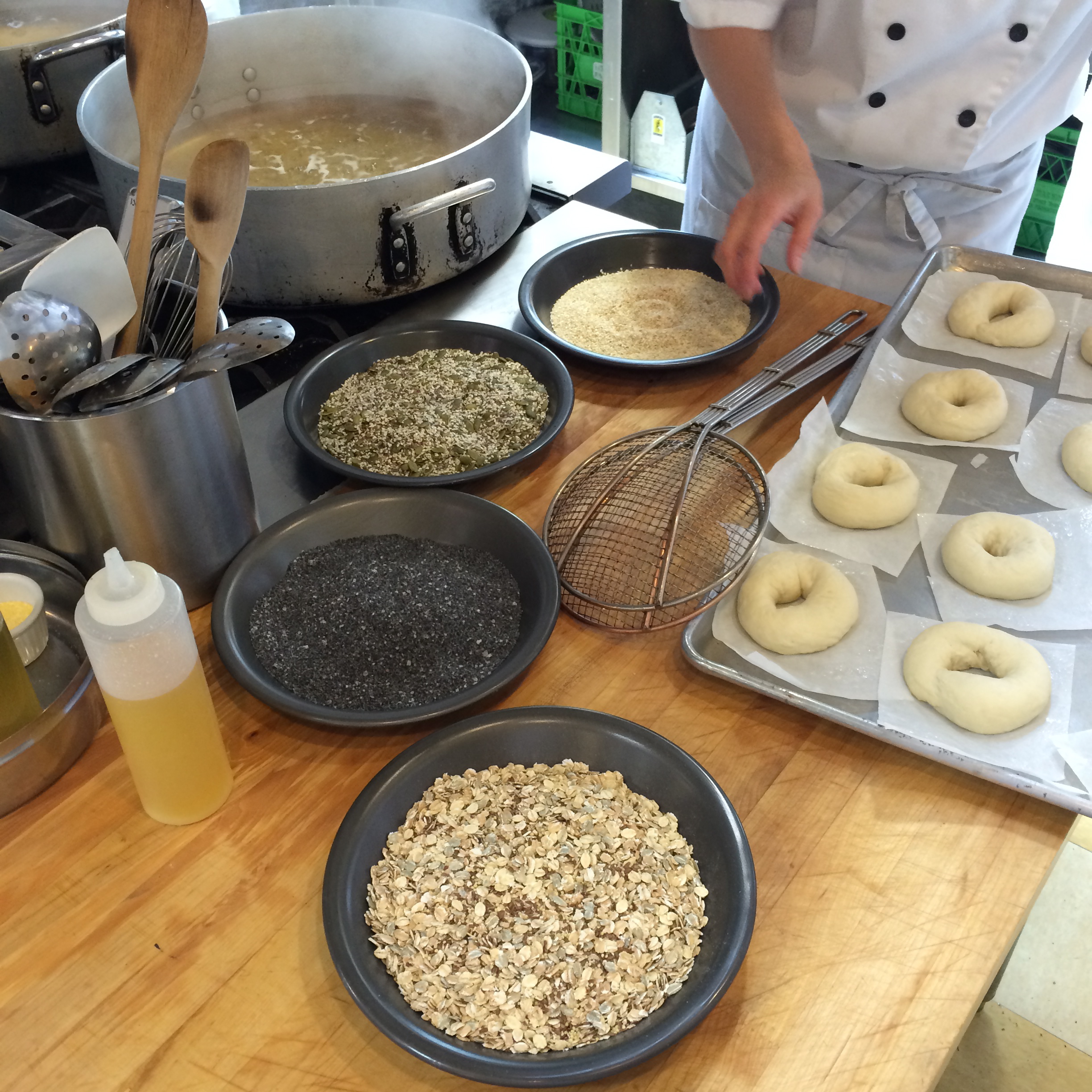 Bagels are boiled in a malt water bath for a few seconds (see this video I took) then topped with your desired nuts or seeds, and baked.