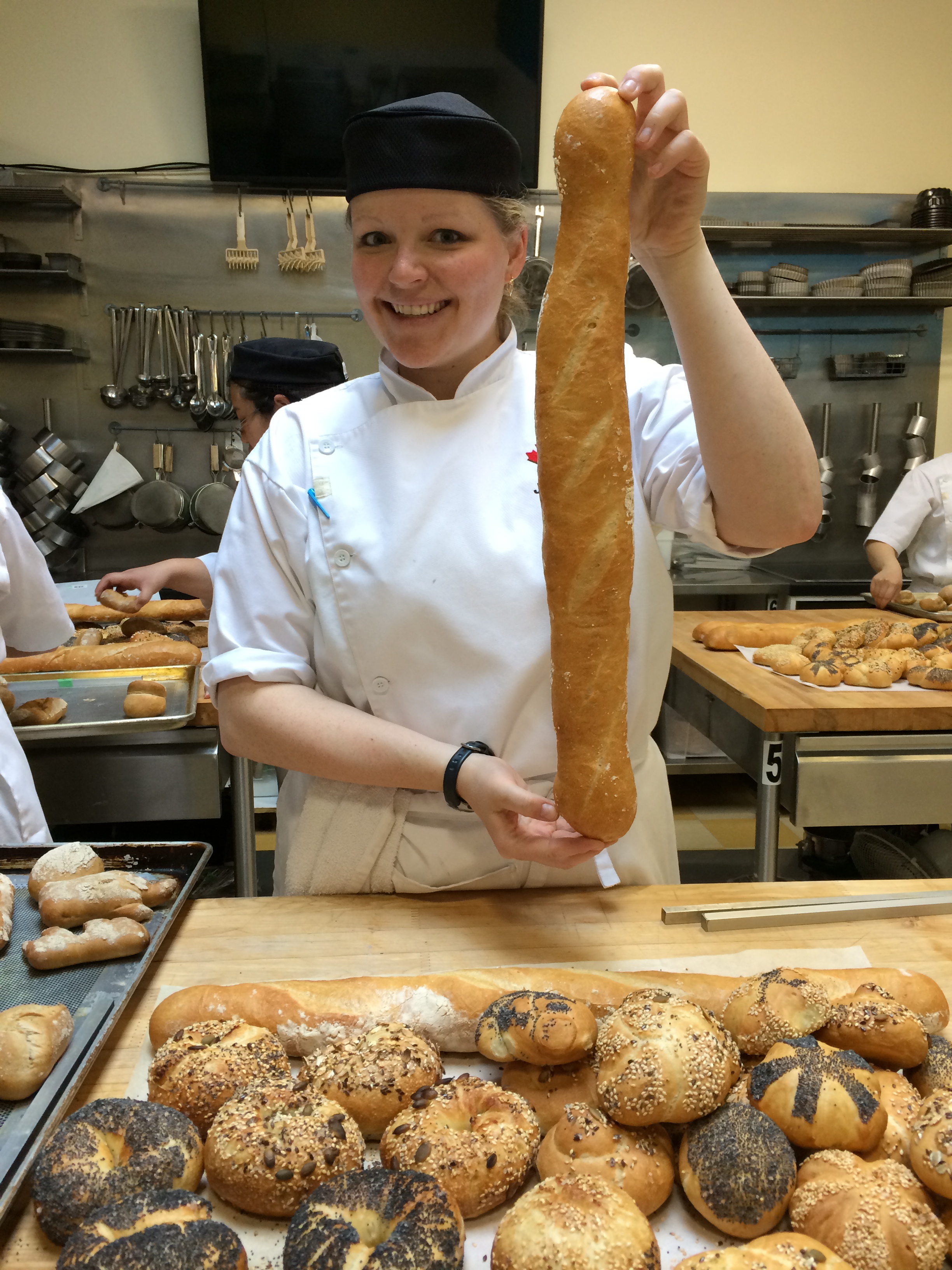 The big challenge for me this week has been making baguettes, and it will continue this week because we make them everyday to practice the shaping – its not that easy! By friday of last week, we’d made them three times and noticed improvements across the class. You have to shape them perfectly without over working the dough (or you get tough bread). We have this coming week to practice – practice makes perfect – and I am determined to make a perfect baguette. They start out in a shape called a batard (a football-like shape) and the shaping process takes a few steps to get it right. I don’t like batards. Darn you, baguette! I’m coming for you this week – look out!