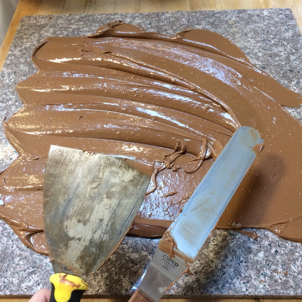 This called marbling the chocolate, one of many ways you can temper chocolate. It is my favourite method. This is a batch of milk chocolate on it’s way to be molded….
