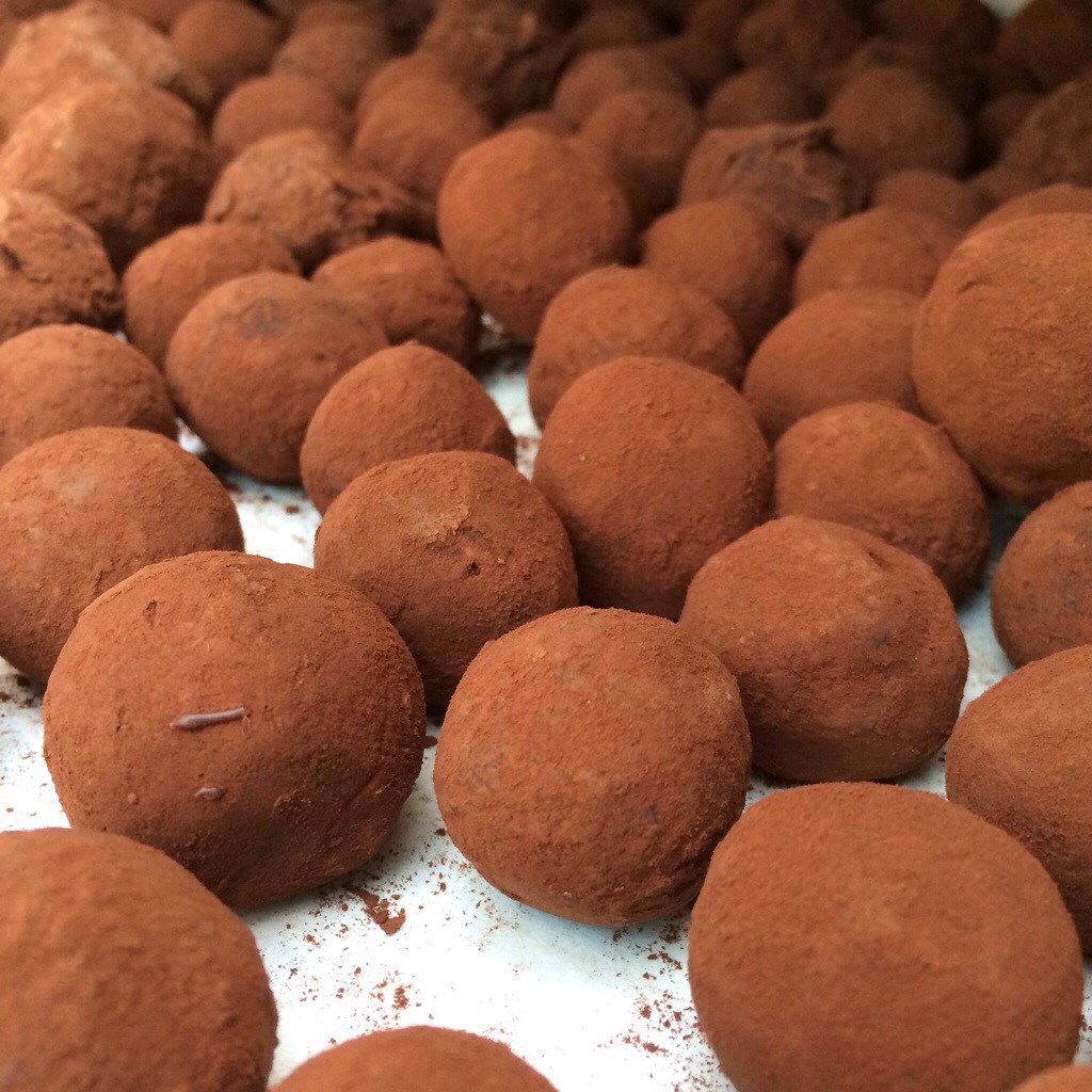 Our class’s truffle work, we made milk chocolates filled with egg ganache (flavoured by choice, my station made blackberry amaretto ganache), dark chocolates filled with caramel, and white chocolate filled with white chocolate passion fruit ganache. Each was finished slightly differently and all are delicious.