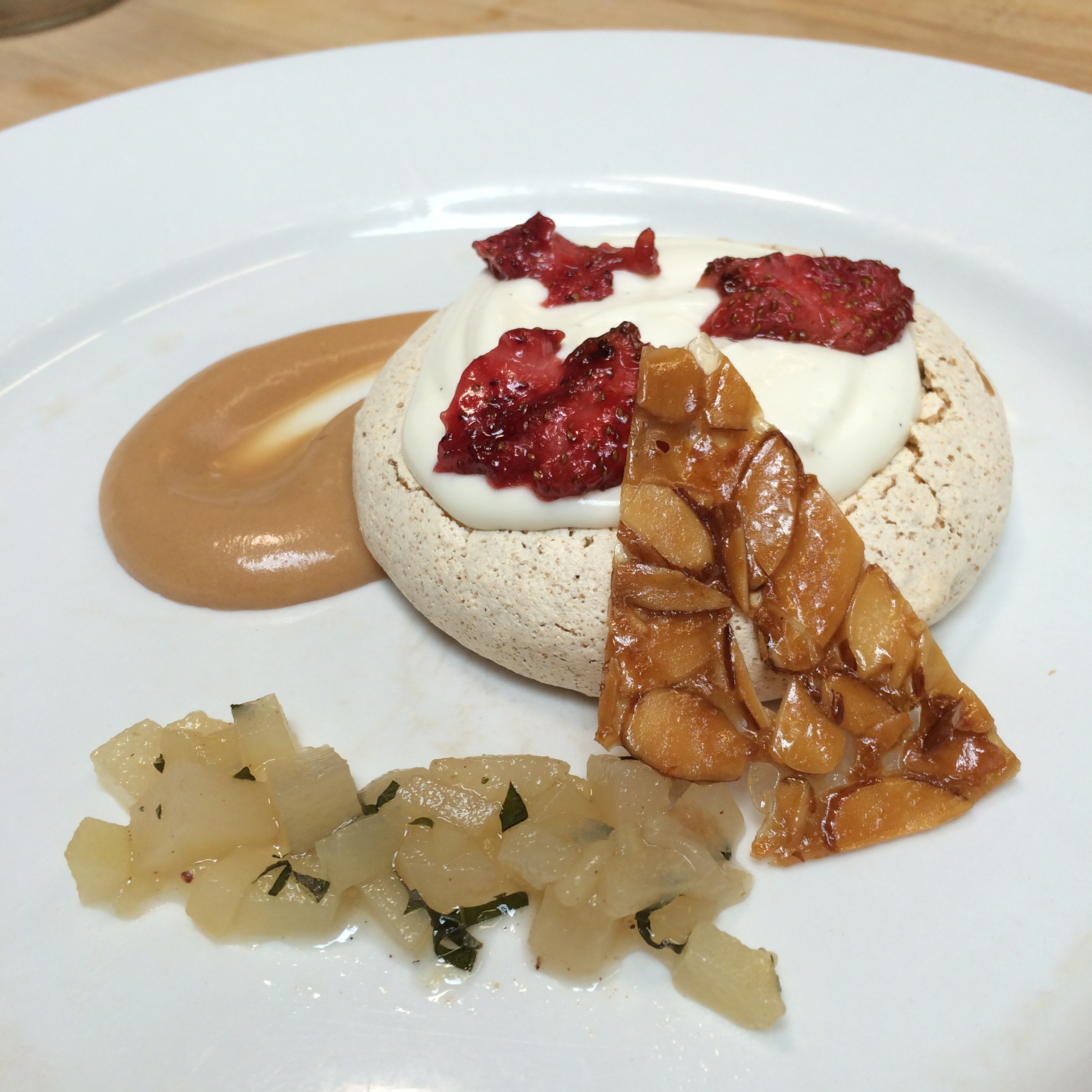 One of the pistachio pavlova’s after critique. Roasted strawberries, pastry vanilla cream fill, orange almond nougatine, caramel sauce, and basil pear salad.