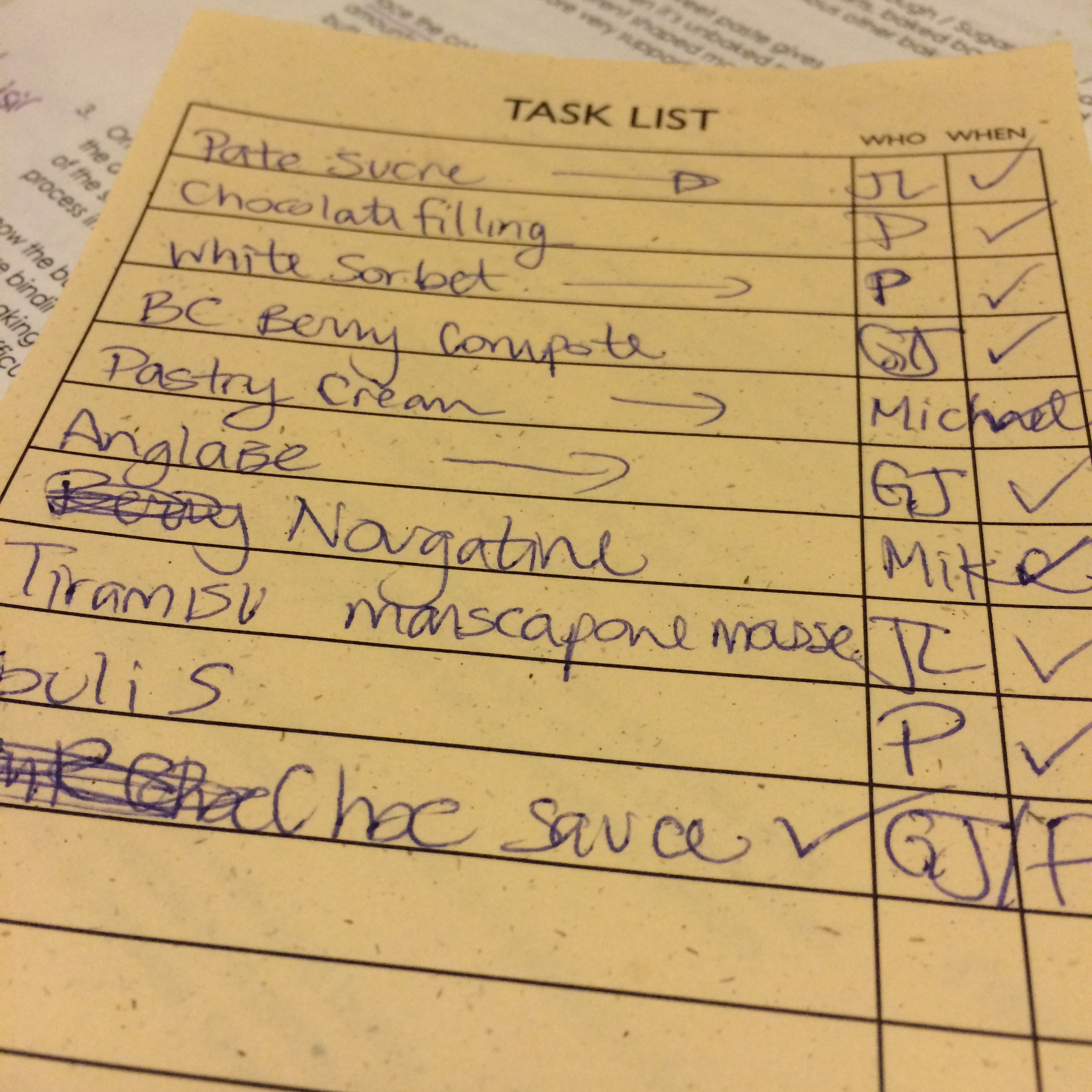 For dessert service we listed each order as it came in and created a code between my partner and I. It worked well, we could have been faster, but considering I am new, I was happy with how we did.