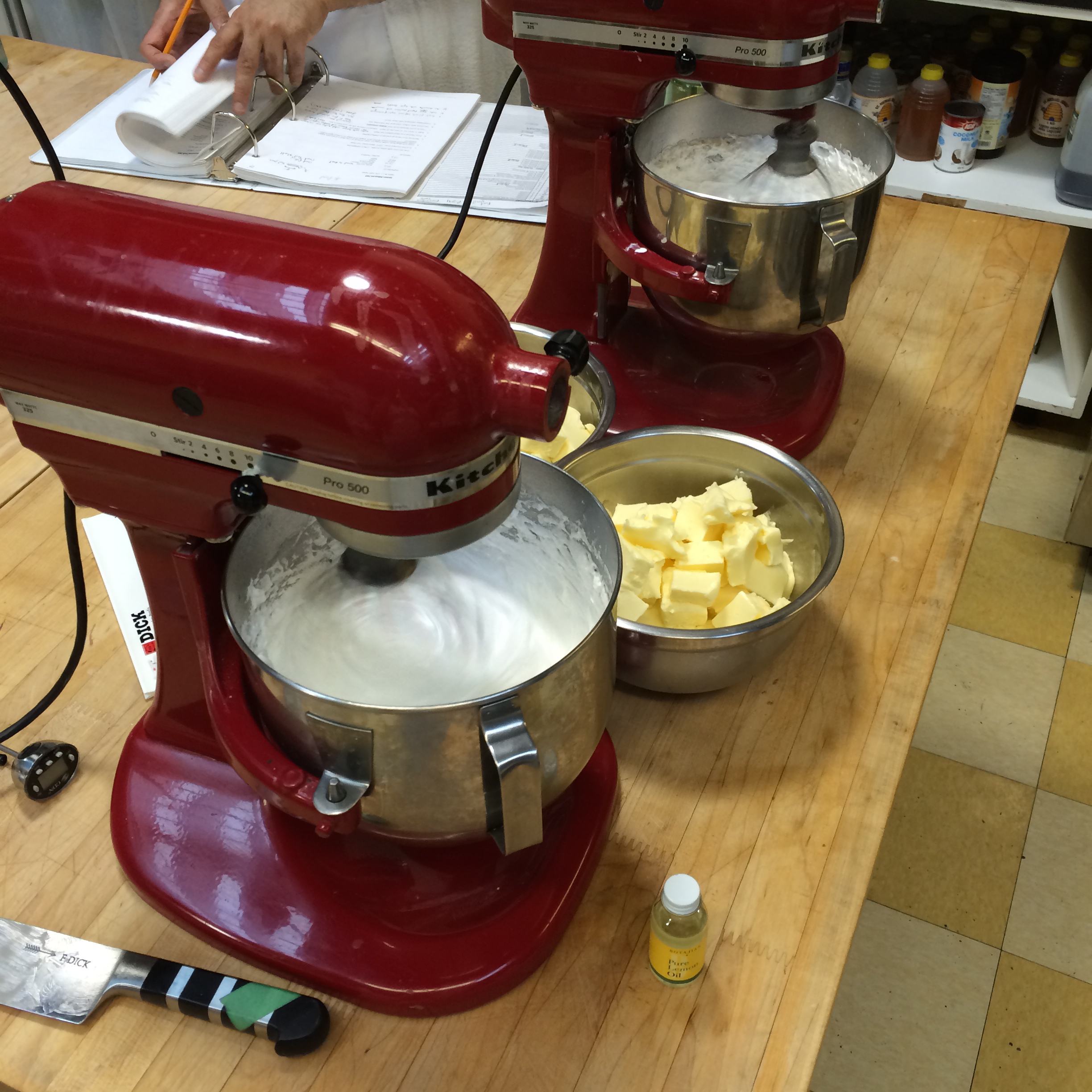 We weren’t able to use the larger mixer so I had to make a double batch of lemon italian buttercream in two mixers at the same time. Boiling sugar is poured into the icing, later followed by butterr…