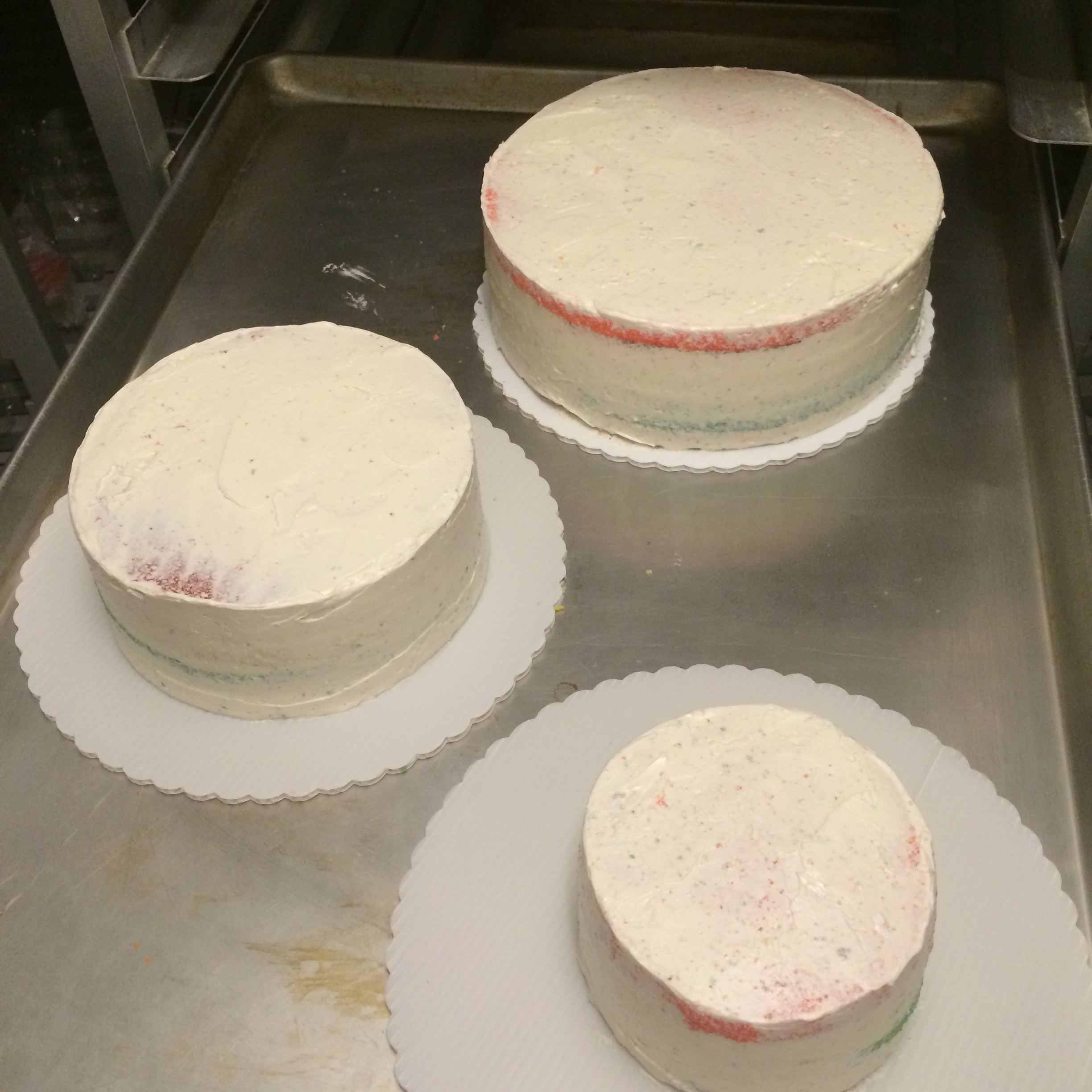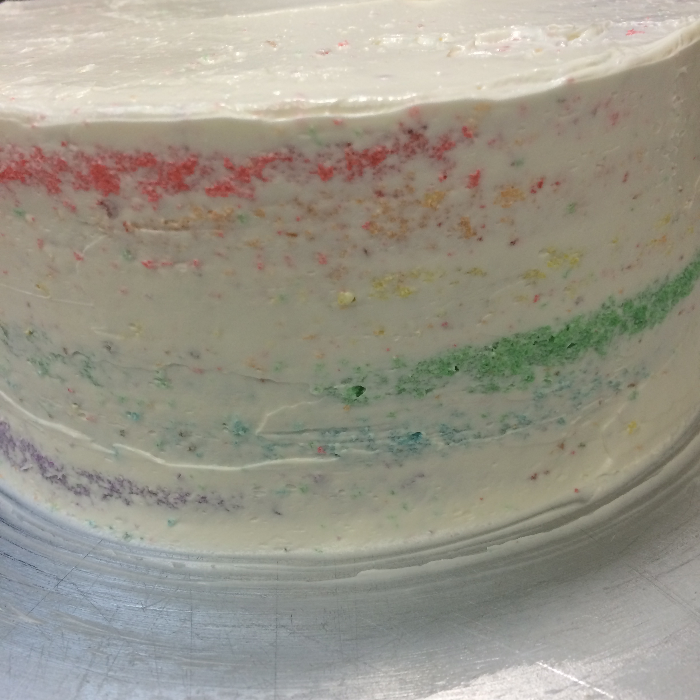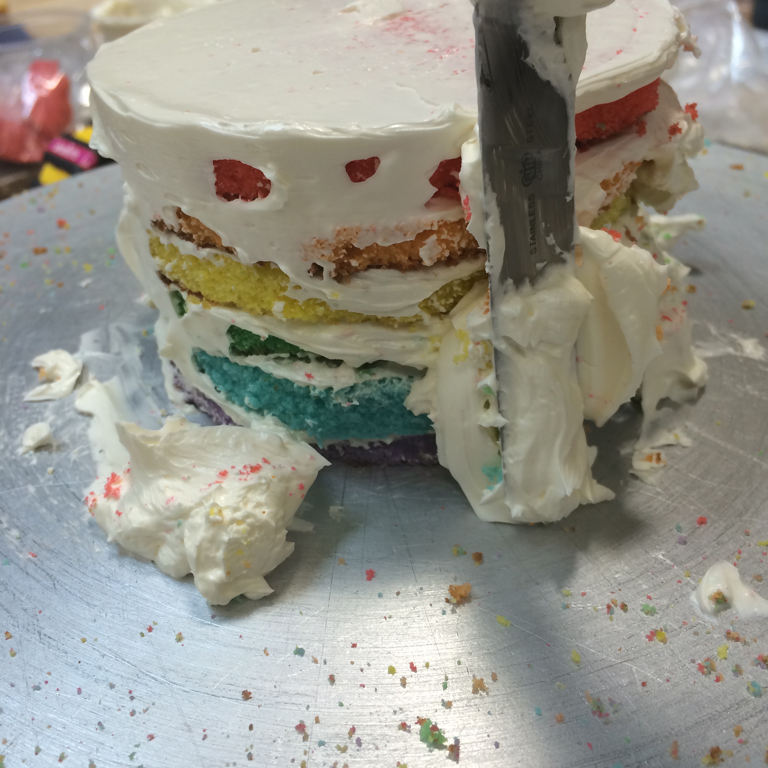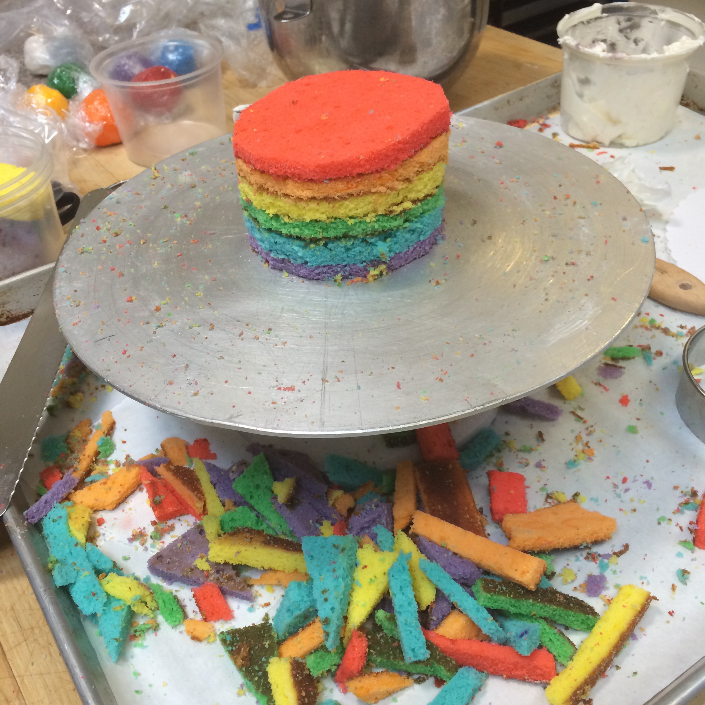 We didn’t have a 4″ round mold, so we had to carve the top tier manually. I just love the rainbow crumbs everywhere….
