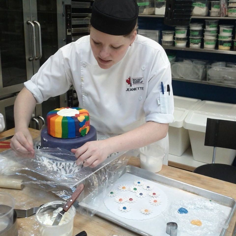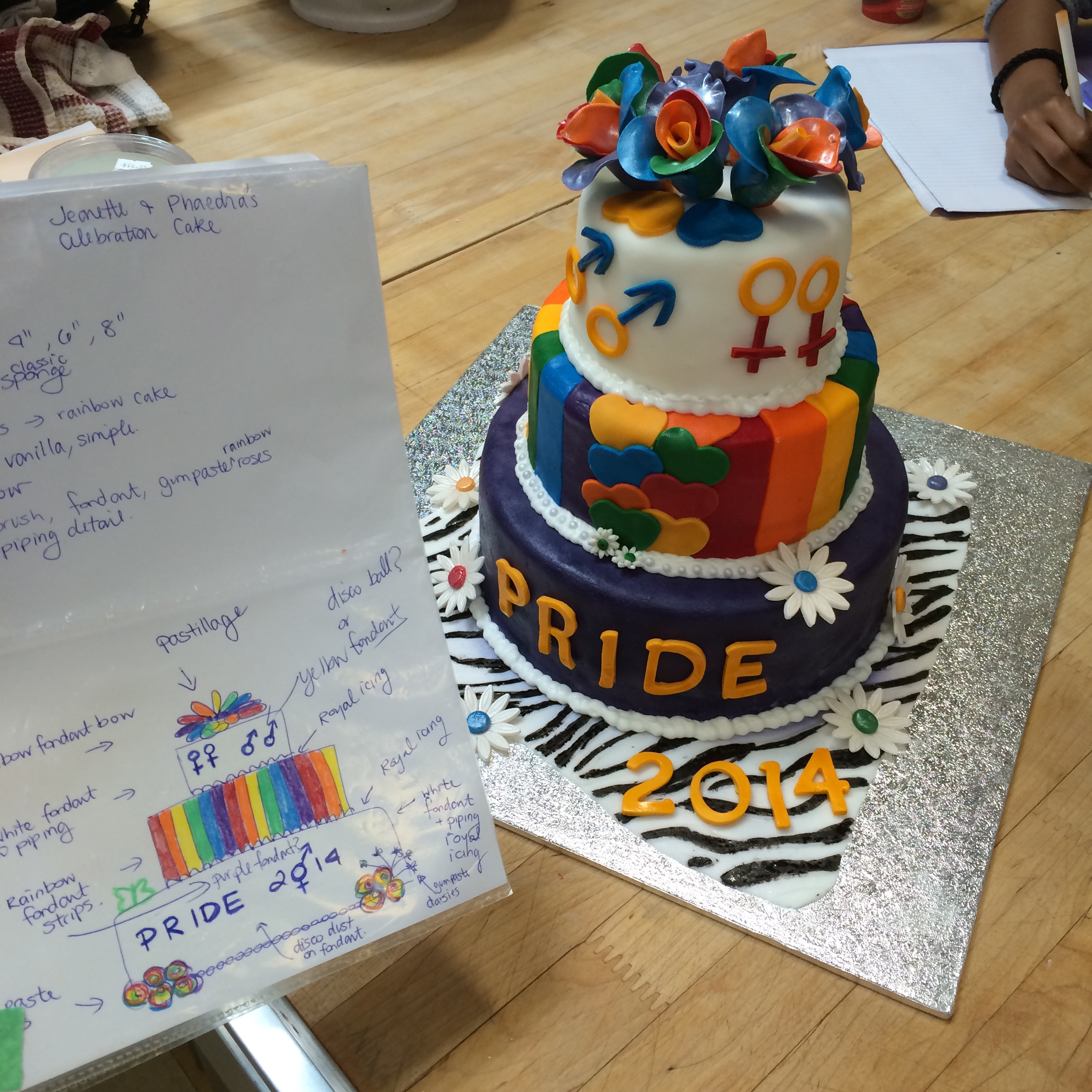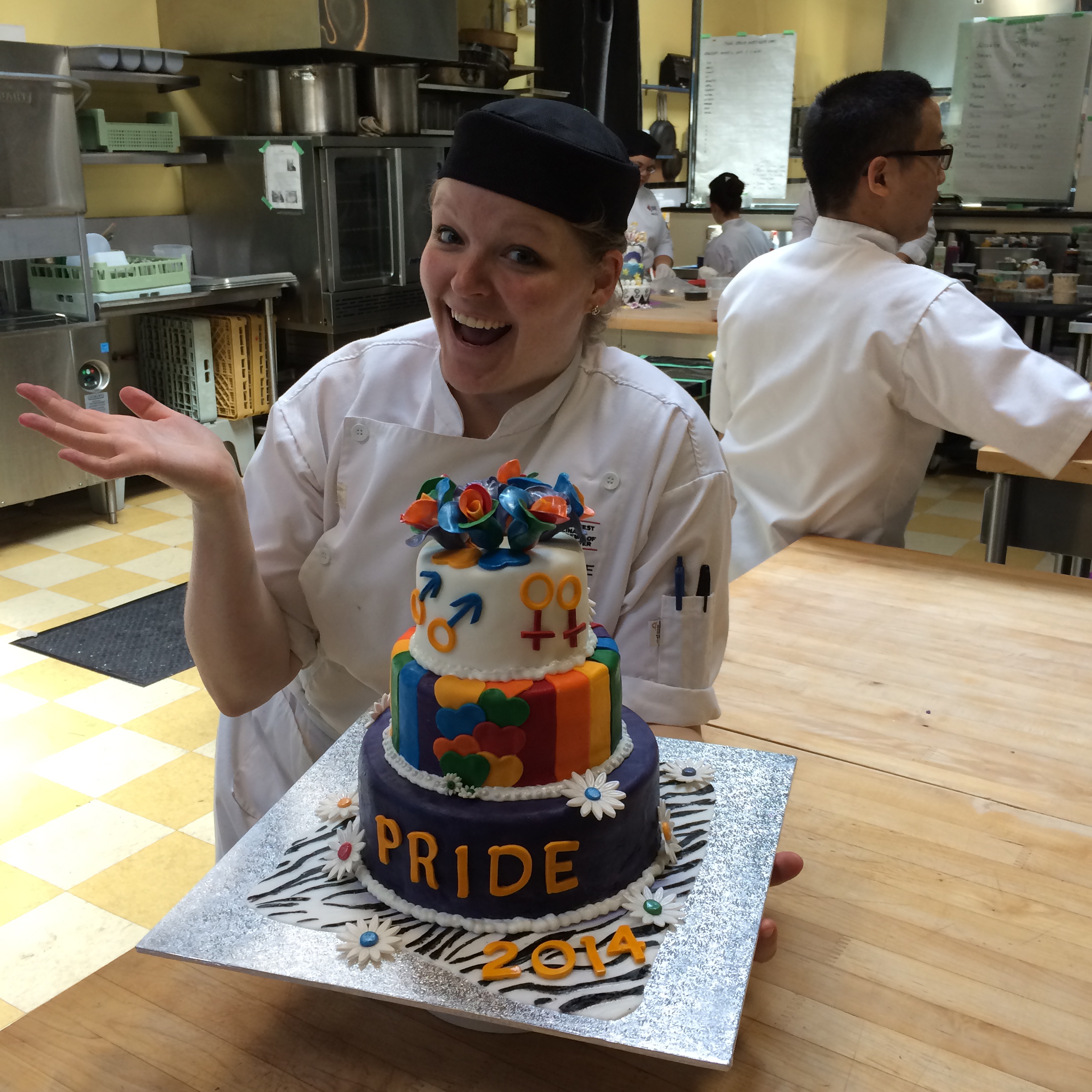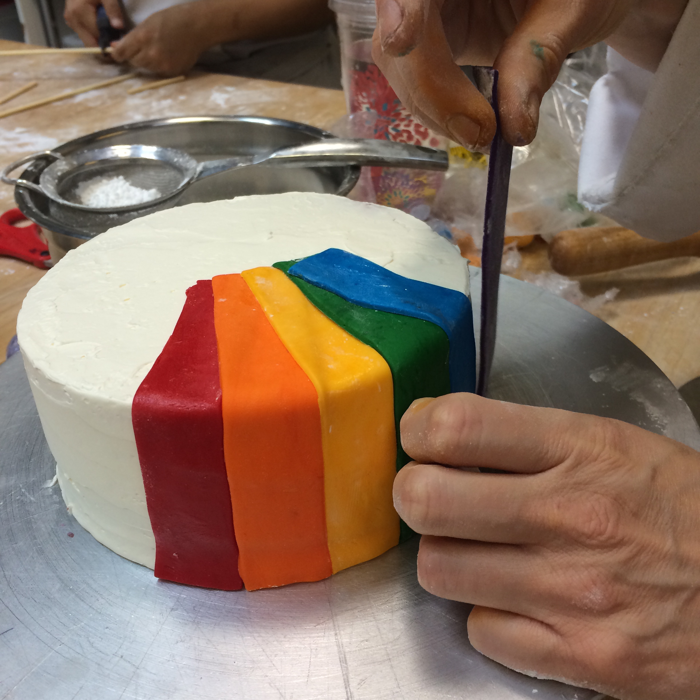 But now back to the celebration cake. A couple weeks ago we were told we would be partnered up and have to create a three-tier celebration cake over 3 days. So my partner and I decided we wanted to make a Pride 2014 cake. We made some sketches and agreed on the cake and fillings. We had to map out our timeline over the three days, task lists at all, and then execute. We discussed our plan with our Chef instructors and incorporated some feedback. The night before the cake day my partner had a family emergency and was unable to come to school. Sadly, life happens. It is a perfectly real situation and the cake must go on. So on Day one, I baked the whole cake and made all the filling. It was a lot of cake, but I had a system going and enjoyed the whole process, while managing to keep us on our timeline. We also had to make all of our fondant and gumpaste from scratch. Most people buy this stuff, ready made, but we had to make it. We chose to make marshmallow fondant, I find it is easier to work with.