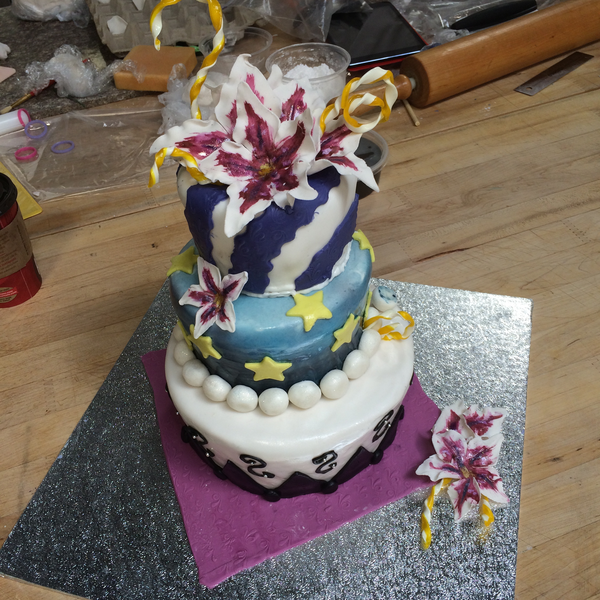 Day two we had to layer all the tiers and ice them. We then covered each tier in fondant and made all the decoration details.