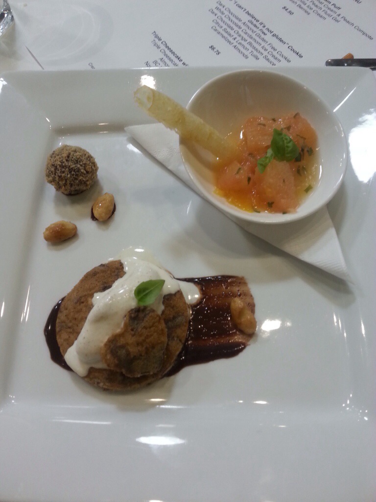 My plating design shifted a bit because of the ice cream trauma, but it all came together in the end. I even put the cookie truffle on each plate for something extra. Here is one photo taken by my sister, one of my dessert guests. Disregard the ice cream though: