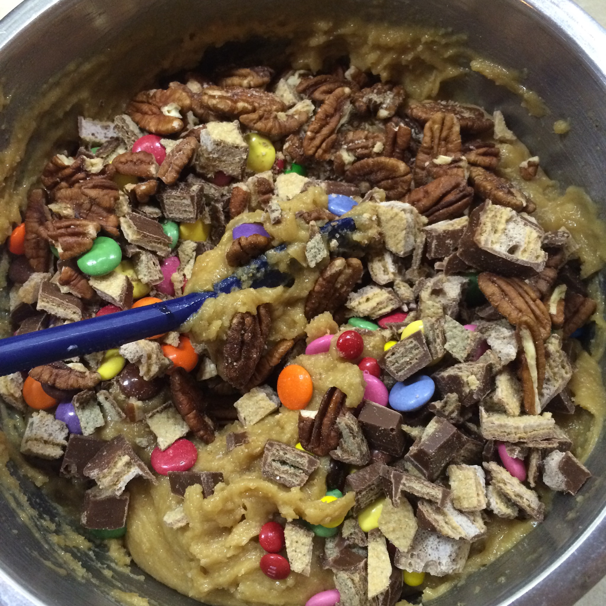 4. Add most (3/4) of your candy and fold in. Save a little bit to top your bars with before baking.
