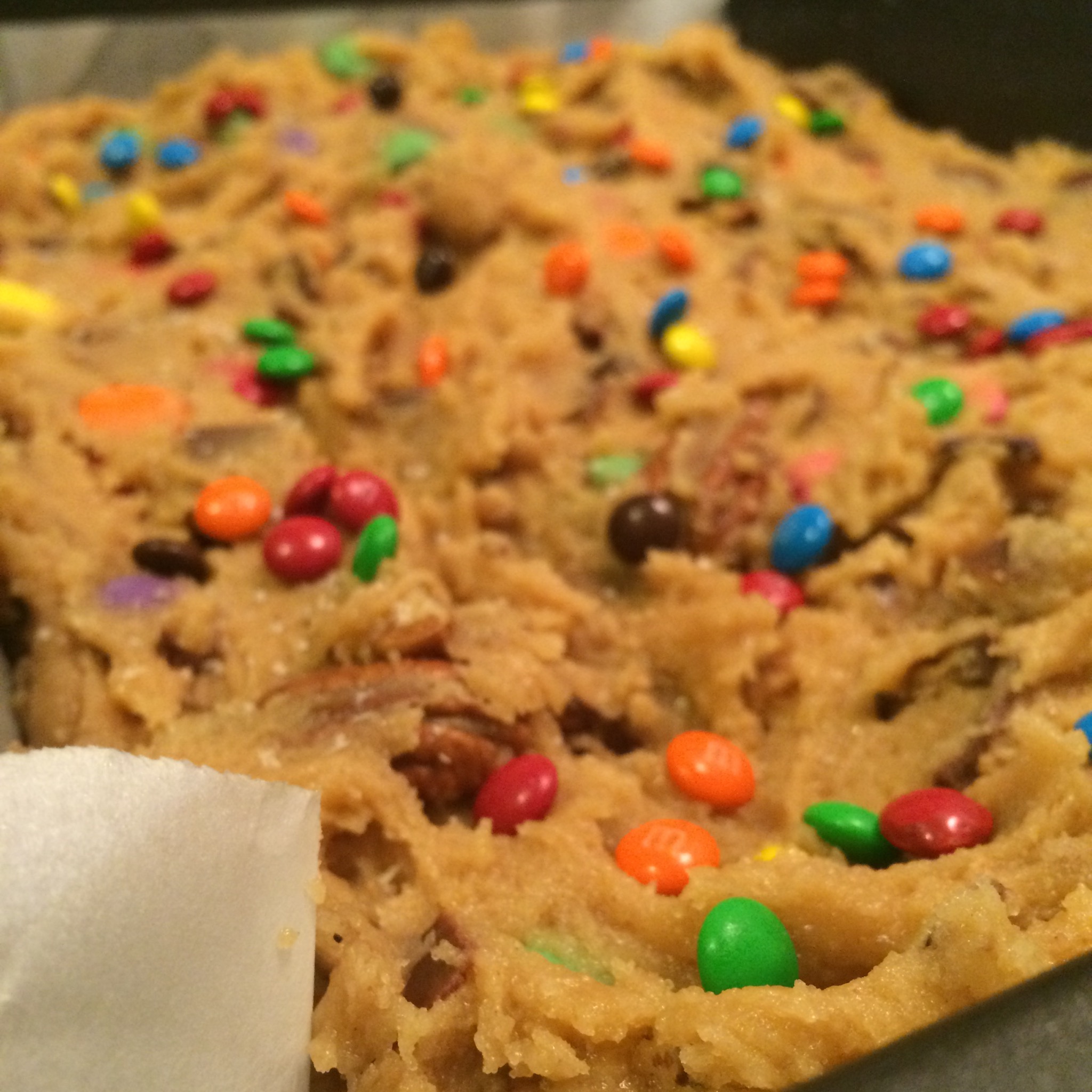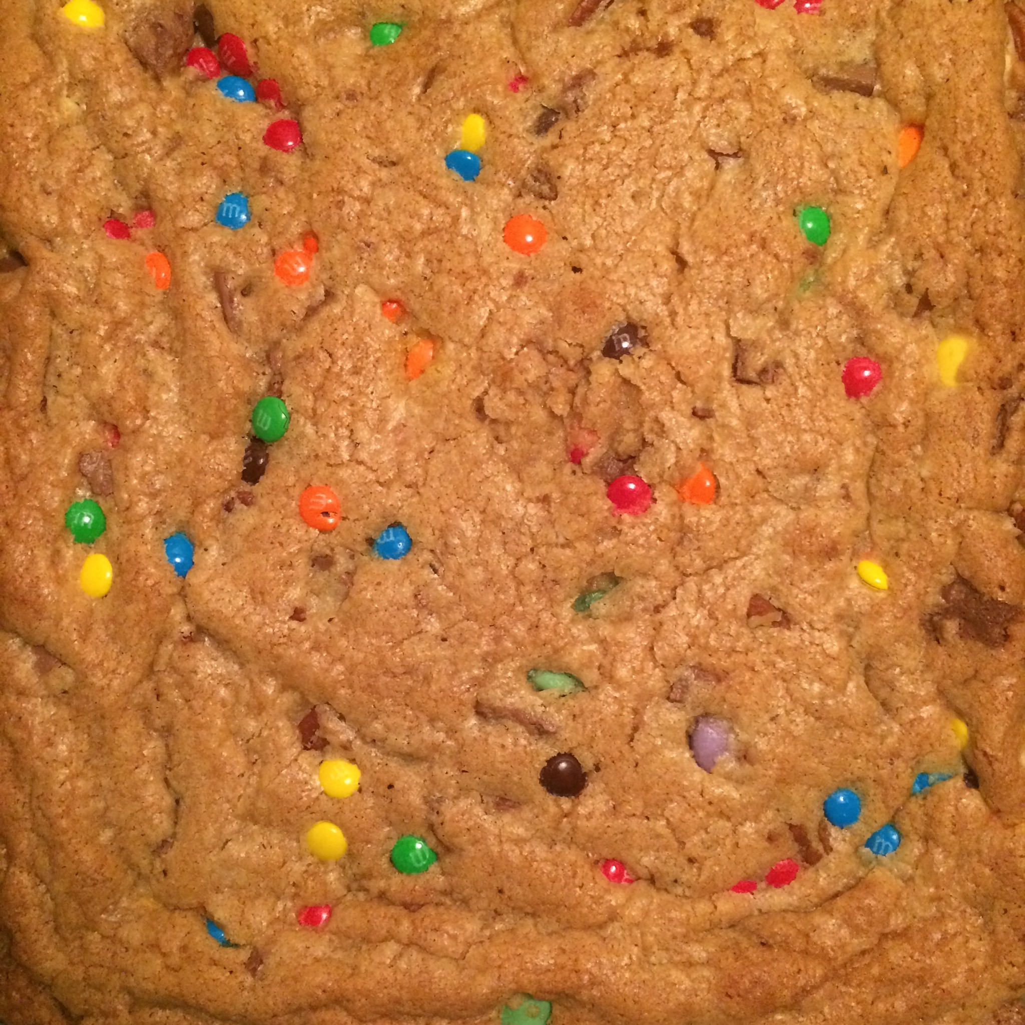 I was thinking of a way to use up leftover halloween candy – if you have any left… Or use some of that sale-candy. And I thought it would pretty much all taste good inside of a cookie. So how about make a candy bar cookie bar?? You can group like-candies together and use those in the bar, or just make a monster-swamp-like cookie of everything. Experiment a little… Why not!