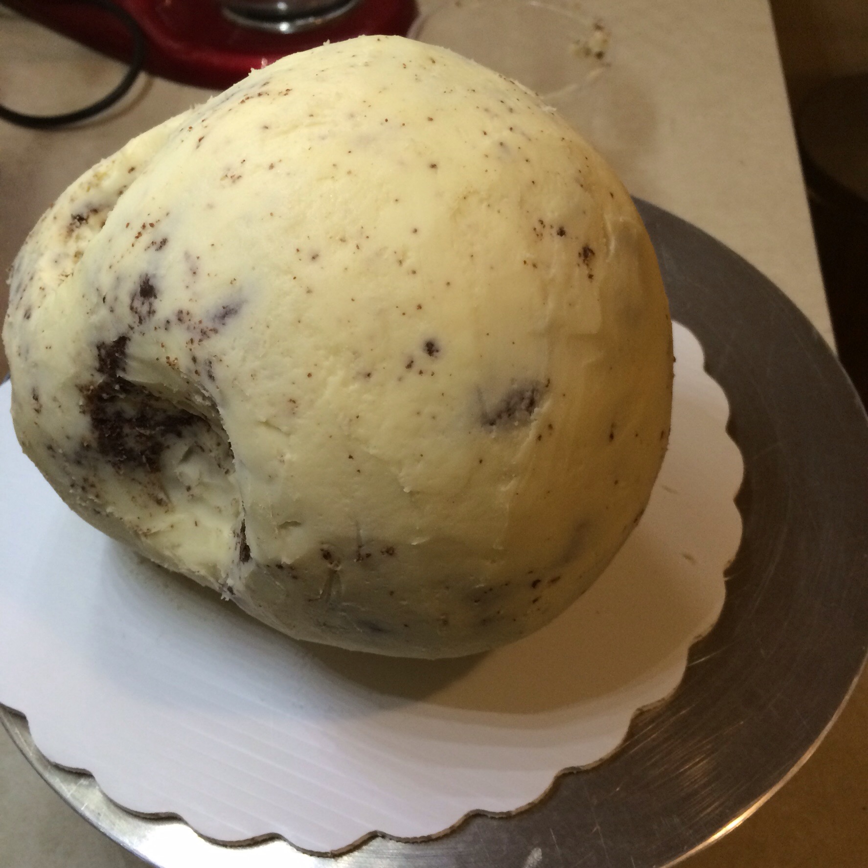 Then I chilled it again, and prepared my space for rolling fondant. The night before I made my marshmallow fondant, learned in school; and my first batch of white modelling chocolate. The latter was a chore, as I never made it before, but wanted to use it because I knew white chocolate would offer the most realistic colour for a skull bone. I researched a bunch of recipes and figured out how to make it, it was easy but I later learned I over mixed it. Then I learned that once it set, it was more chunky and should have been smooth. I managed to correct that with a little nudge of heat in the microwave. Then it kneaded very smoothly.