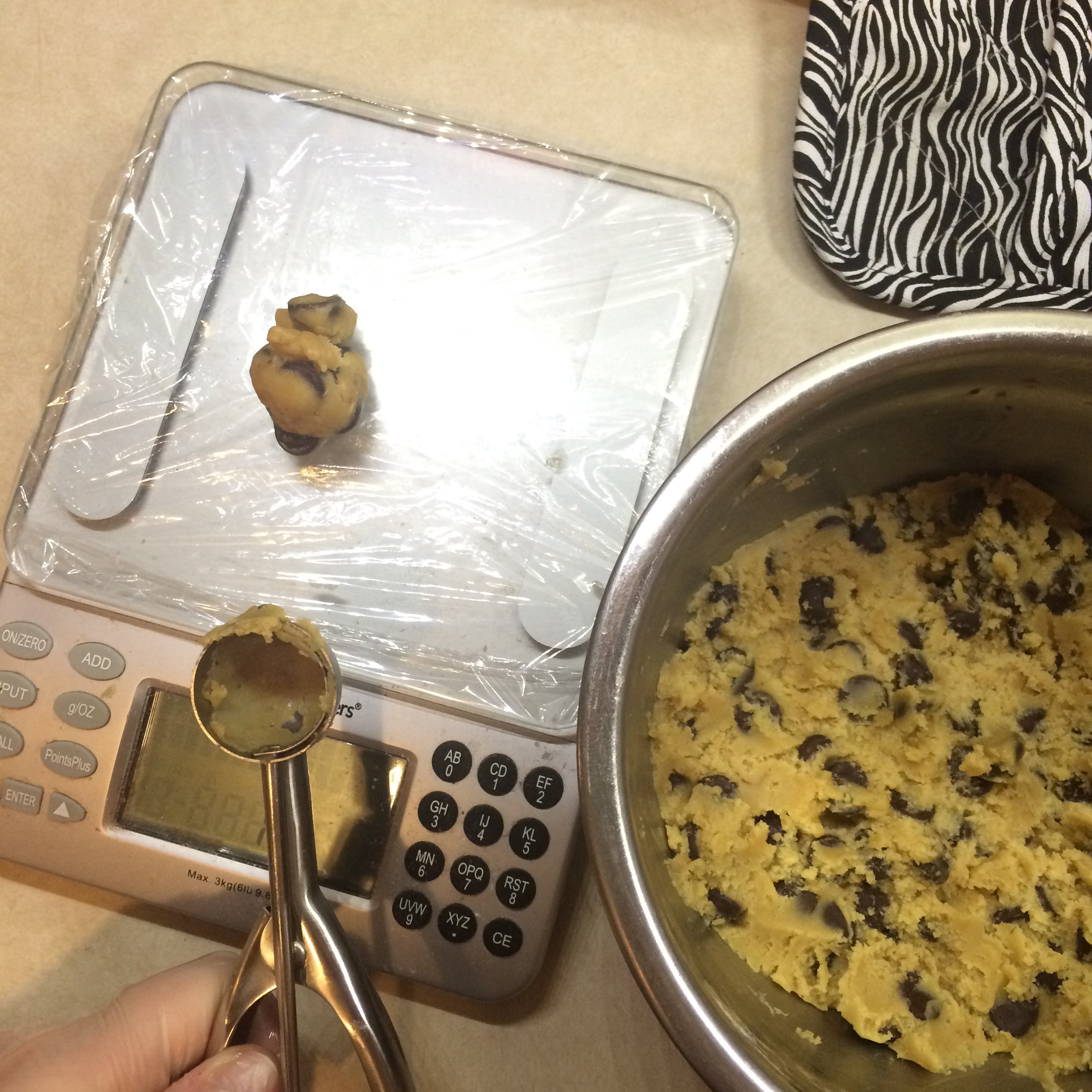 4. Scoop even sized portions of dough, using a cookie scoop or two spoons. I used a mini-scoop and weighed out my dough into g portions. After tasting the dough, I knew it wouldn’t be too sweet and perfect for making mini-sandwiches filled with buttercream!!