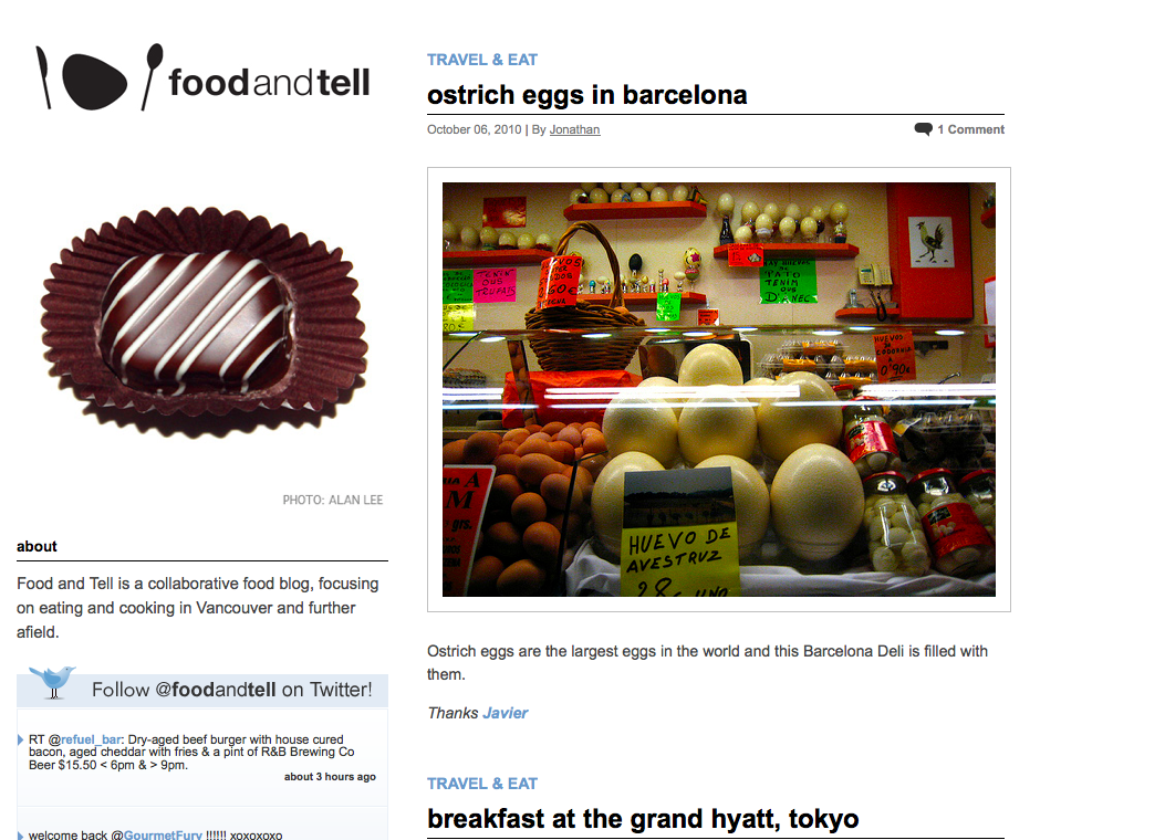 Vancouver based, Food And Tell is archived well with links, categories, archives and popular tags. The blog covers eating and cooking in Vancouver, and local places to check out. Once again, a familiar pattern with blog or bust shares, this food blogger is on Twitter too: @foodandtell