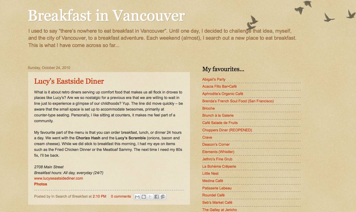 ATTENTION Vancouver foodies and fellow brunch lovers, unite here, and bookmark this blog: Breakfast in Vancouver. Blogging about weekend breakfast adventures since June of 2007, this blog covers it all and archives (with a map too) so you can reference anytime you want to find a new brunch around town.