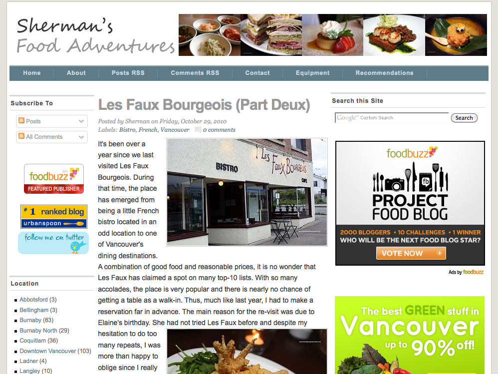 Which of your posts generate the most activity? The posts that I get the most hits on are for La Charcuterie, it’s just this sandwich shop in Port Kells [Surrey] with this sandwich guy called the Sandwich Nazi who berates his customers. The sandwiches are ok, they are good value; I guess people want to experience ‘the Sandwich Nazi’. Other than that, a lot of trendy restaurants from tourists and people looking for the hot spots in town.