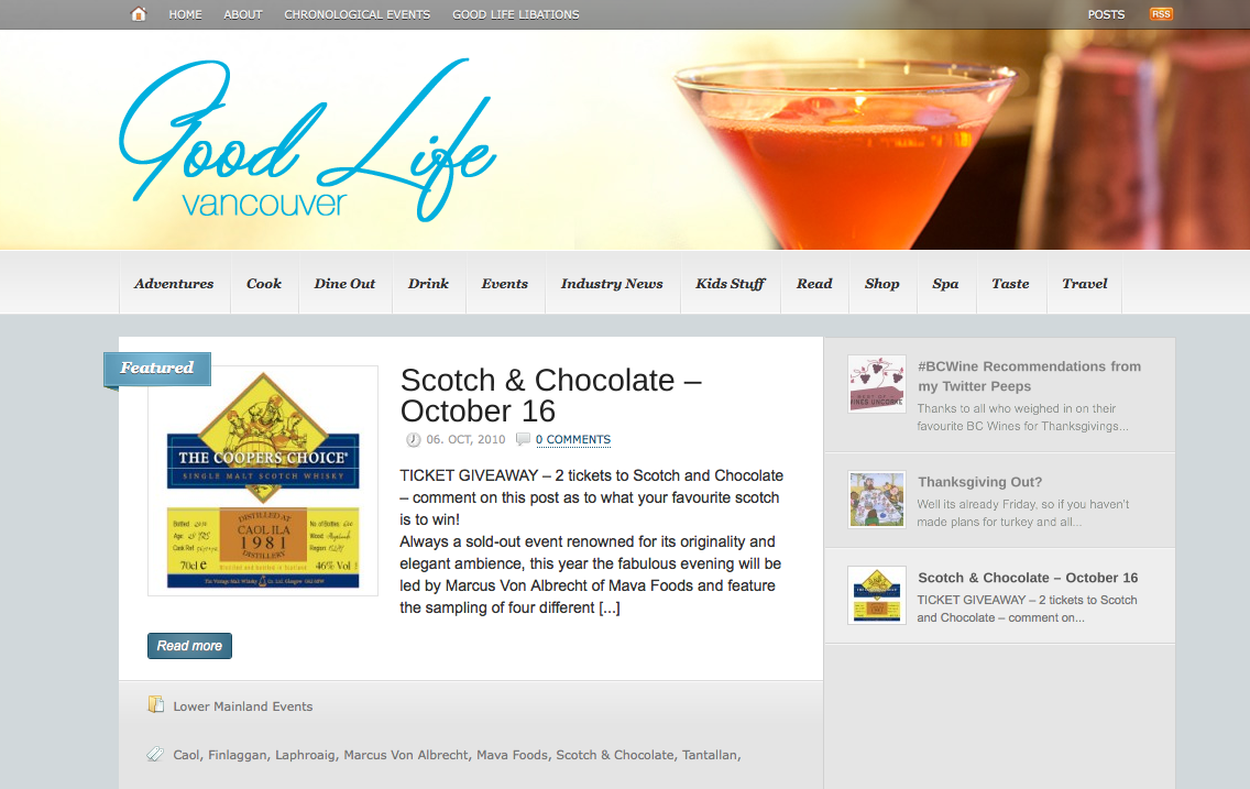 Good Life Vancouver is a blog that covers Vancouver and beyond – it is a large site that is well designed and fun to poke around on. The navigation bar includes fun headers like Cook, Dine Out, Drink, Events, Taste, or Travel, making it easy to find what you want fast.