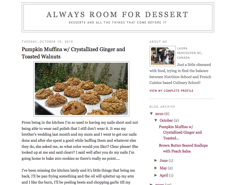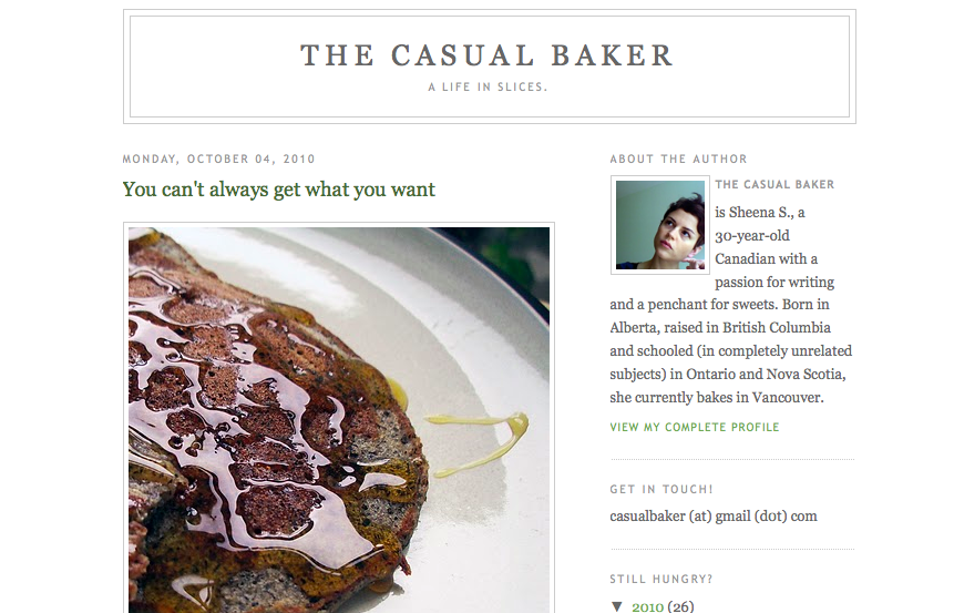 #11 – Casual Baker, is sweet blog written by Sheena, a Vancouver women with a self proclaimed penchant for sweets – bake on my fellow foodie! Her blog is simply baking, since 2006, and covers an array of recipes, handy to have in your shortcuts toolbar as a cookbook in your virtual library (She even has a recipe index – convenient!). Her stories paired with the recipes are great, sometimes including music video YouTube links and other fun-interesting parallels.