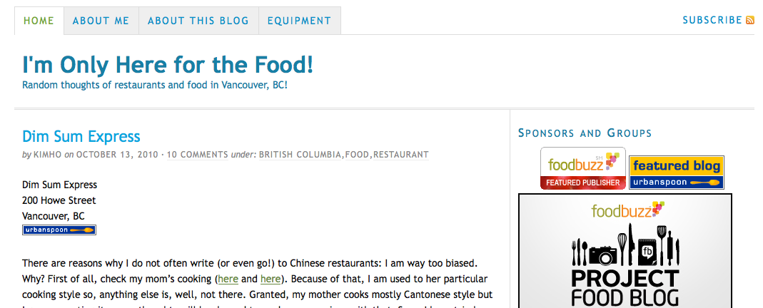 I’m Only Here For The Food – A great Vancouver food blog a local, that reviews a variety of local restaurants. The author shares they does not have a formal culinary background, through the about page, but has an adventurous food philosophy to live by, “taught to appreciate food and [have] willingness to try almost anything.” I think the content of this blog reflects this policy! Well done!