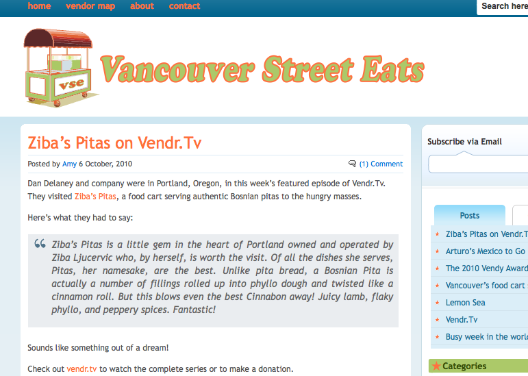 Vancouver Street Eats – Another great name for a food blog in Vancouver, especially with the recent addition of more food vendors and ‘street eats’ following the Games earlier this year. Lots of fun pics of food carts on the street downtown in Vancouver, reviewing them all as new additions to the food scene in Vancouver. This blog is also a relatively new one, established this year. This blog is extra cool because it includes videos and maps of the exact location of the street eats! A FUN FOODIE FOLLOW!