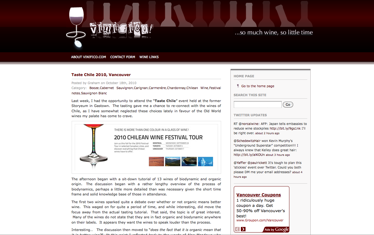 VINIFICO, is a magnificent wine blog, based in Vancouver. Yes, a blog purely about wine, and some food too. The name of this blog alone is a tasty one, I am a fan of the puns myself, so I cannot help but appreciate other pun-makers. Blogging since 2005, Sean has hosted Vinifico and describes his blog as his online wine journal – with contributions from his friend Graham here and there.